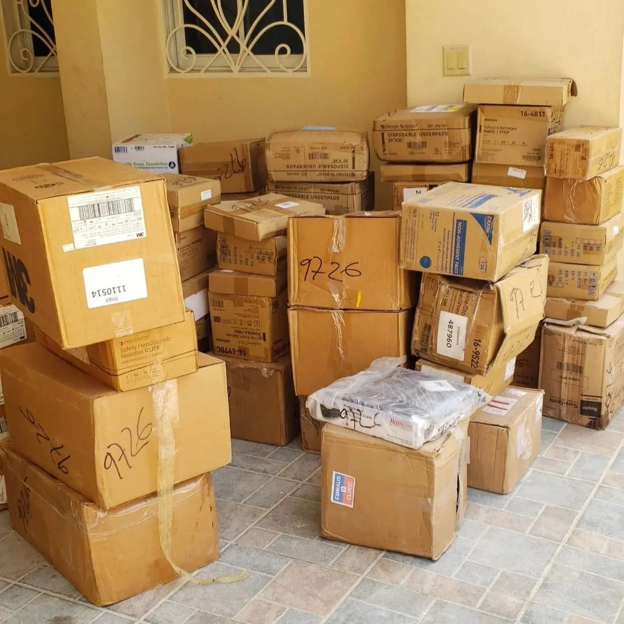 A large quantity of medical supplies was donated by Evernorth Health Services. The boxes arrived at the clinic recently.
